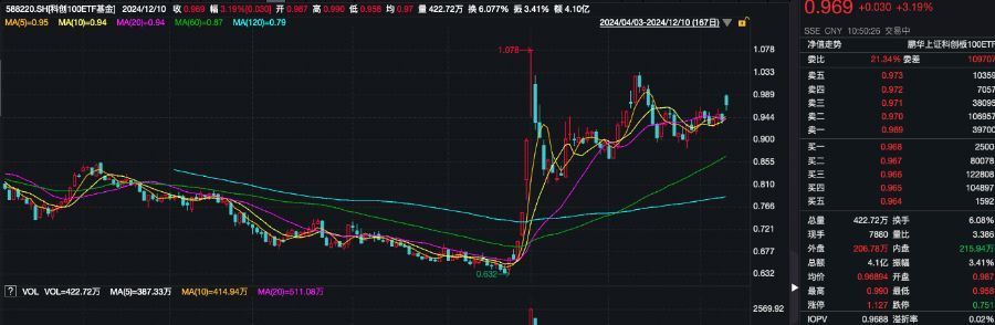 相关ETF方面,科创100ETF基金(588220)截至发稿涨3.19%,成交额4.1亿元,换手率超6%,早盘交投活跃,溢折率0.02%,盘中频现溢价交易。